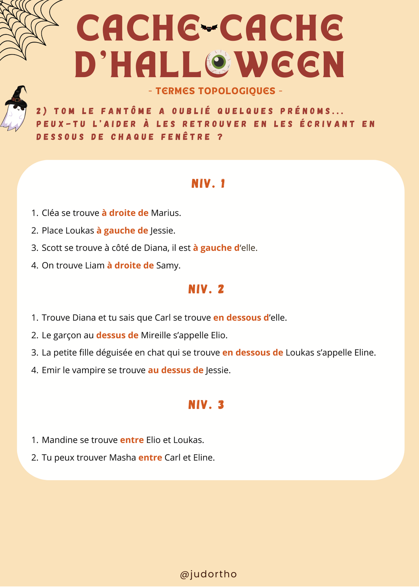 Lecture/compréhension écrite (ou orale si l’enfant n’est pas encore rentré dans le langage écrit) de phrases + compréhension de 5 termes topologiques (à droite, à gauche, en dessous, au dessus, entre).