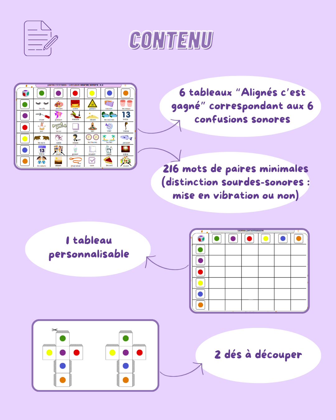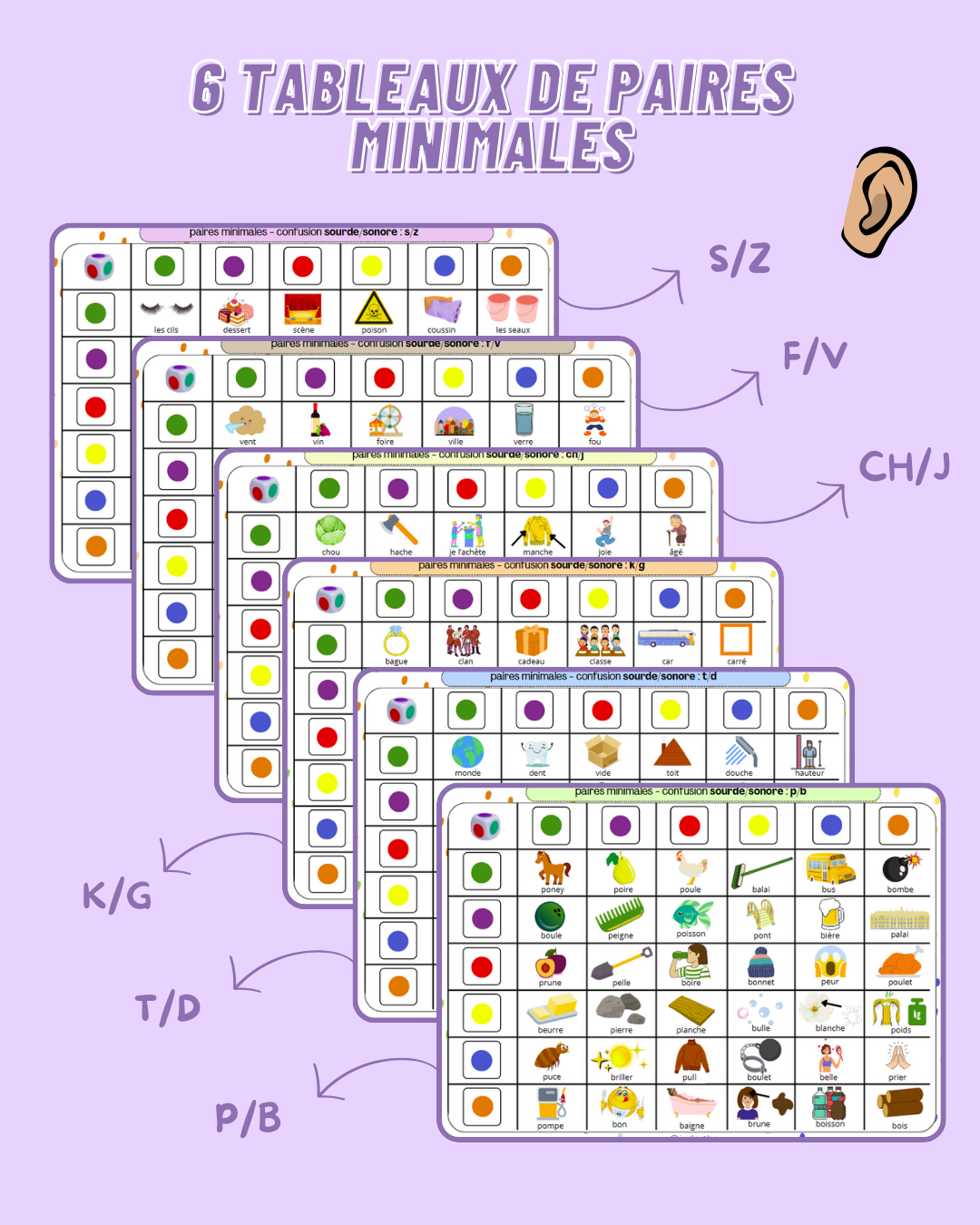 1 PDF de 6 tableaux correspondants aux 6 différentes confusions sonores qui se différencient par la mise en vibration ou non des cordes vocales (souvent confondues).