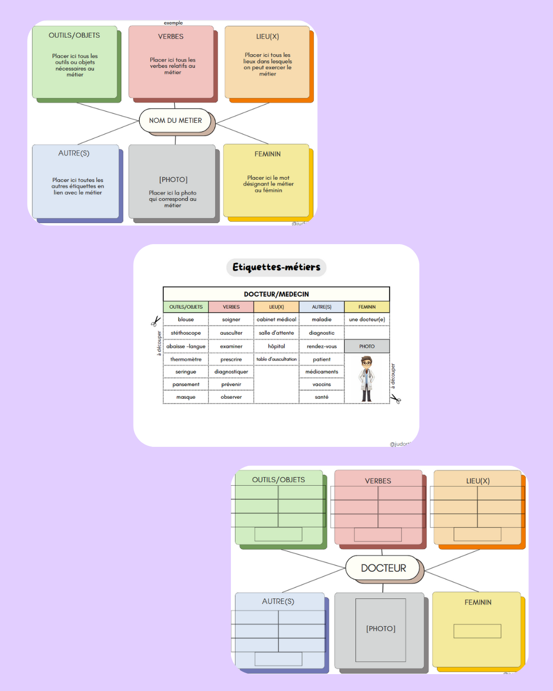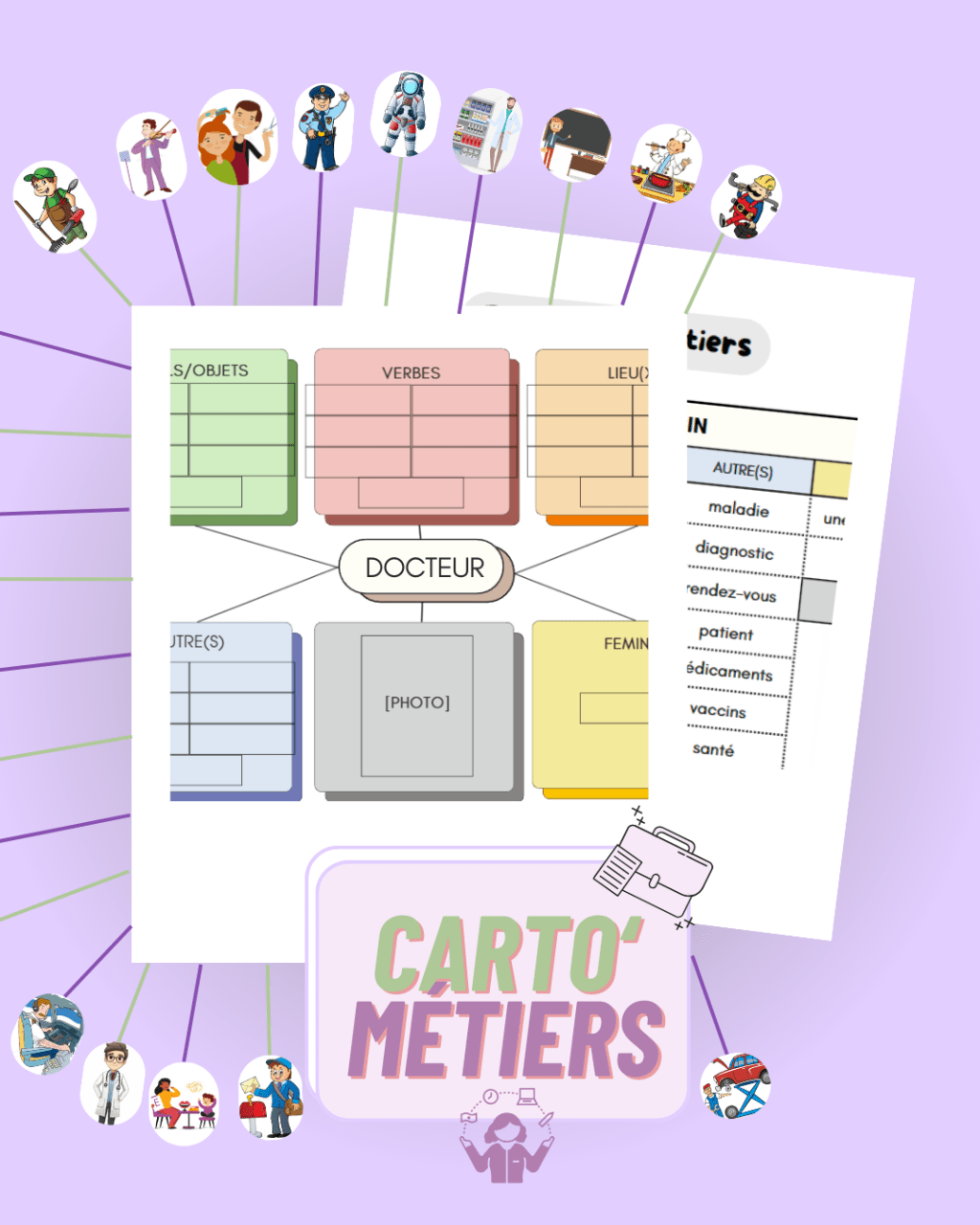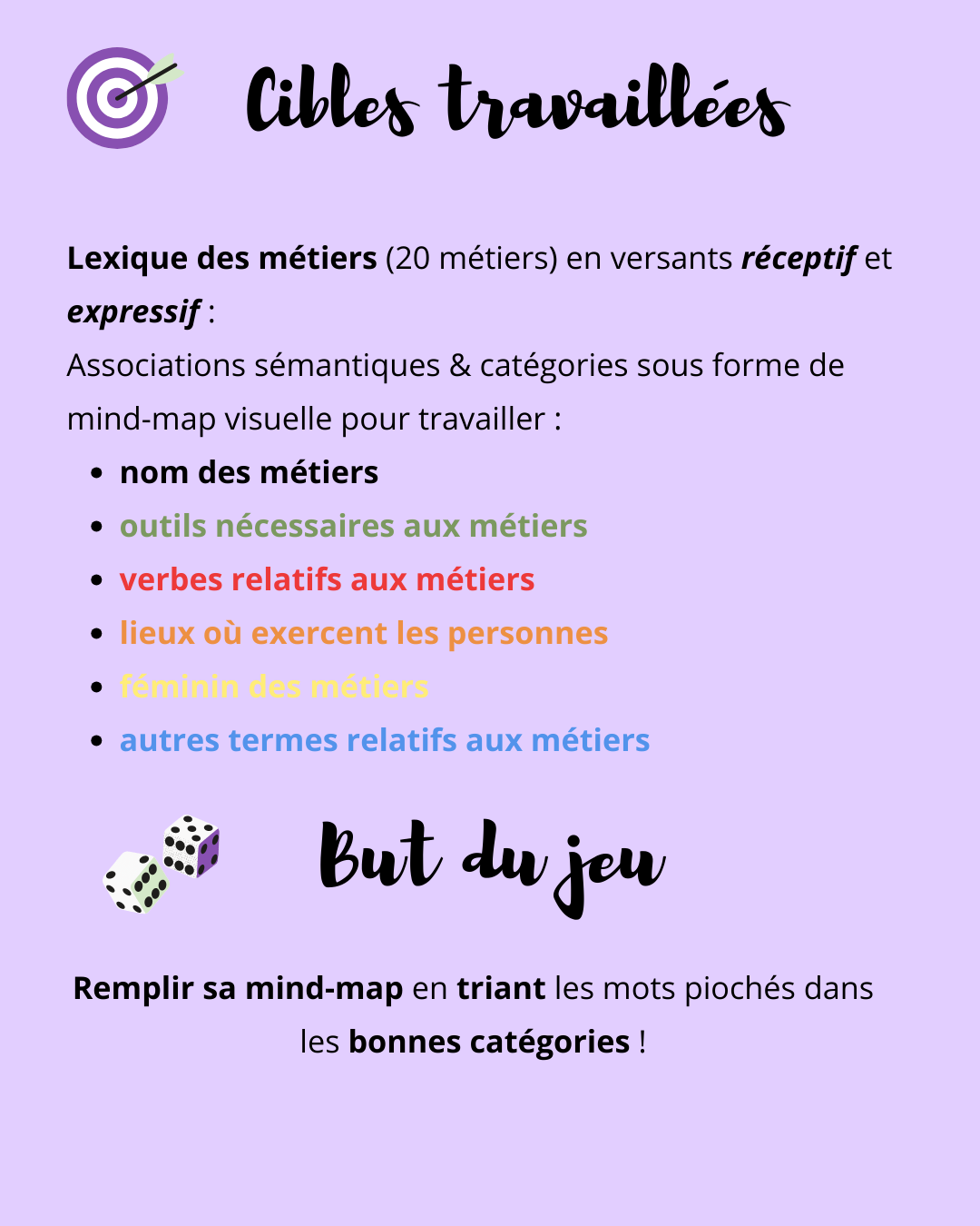 1 PDF permettant de travailler le LEXIQUE des METIERS en versant réceptif et expressif (associations sémantiques & catégories sous forme de mind-map visuelle)