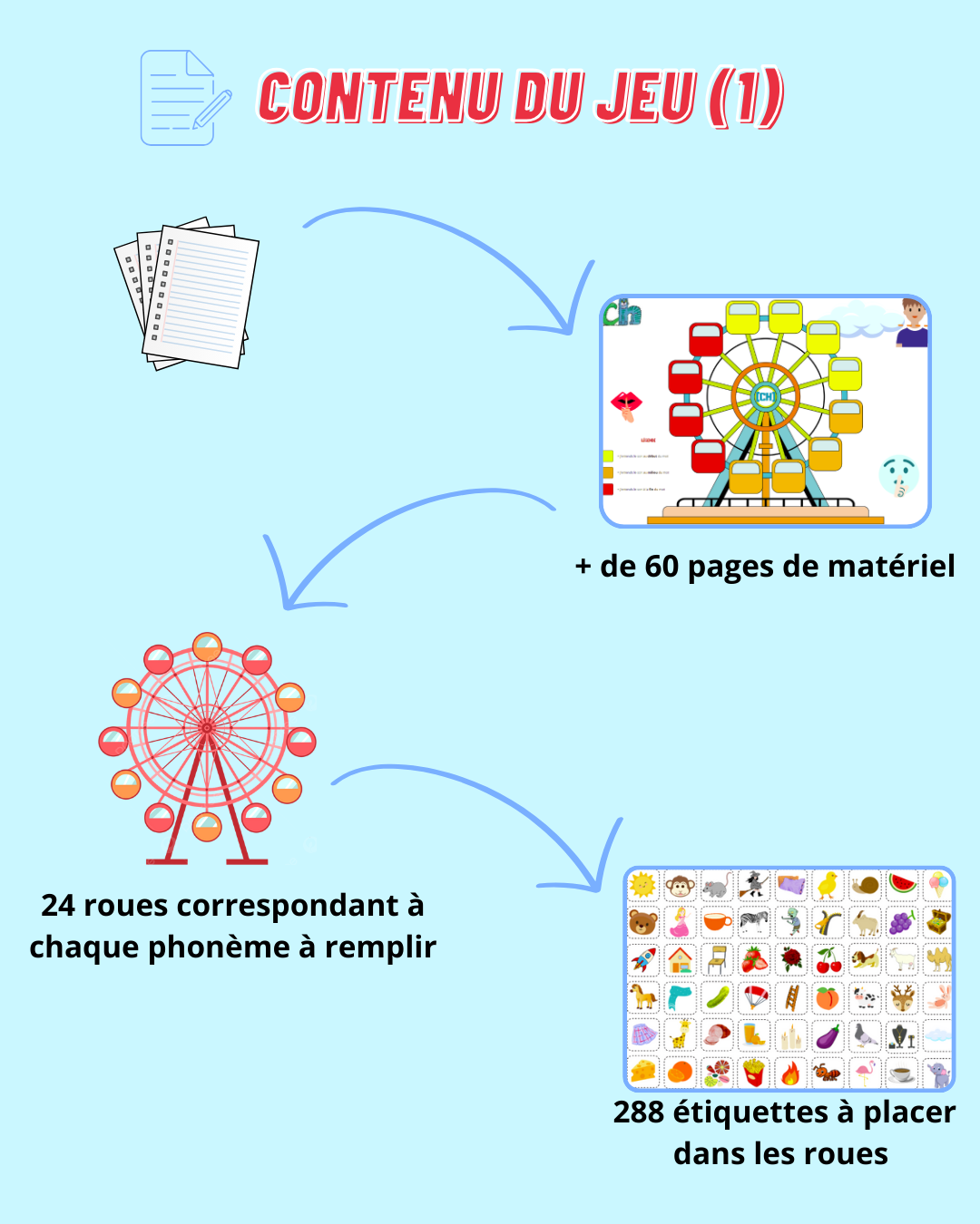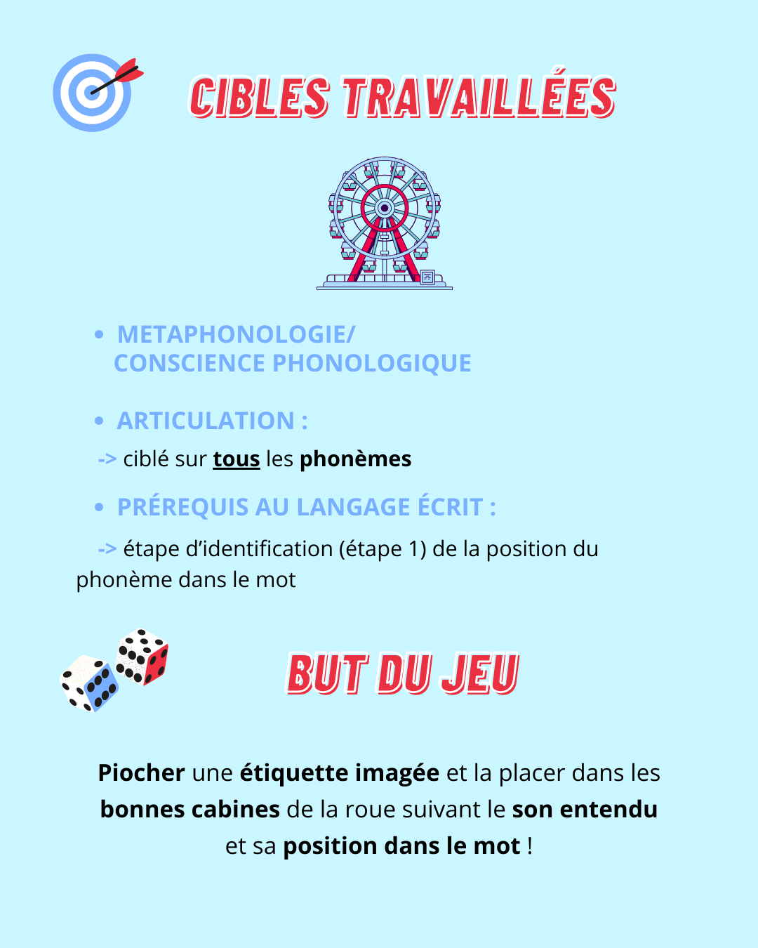 -> Piocher une étiquette et la placer dans les bonnes cabines de la roue en fonction du son entendu et de sa position dans le mot