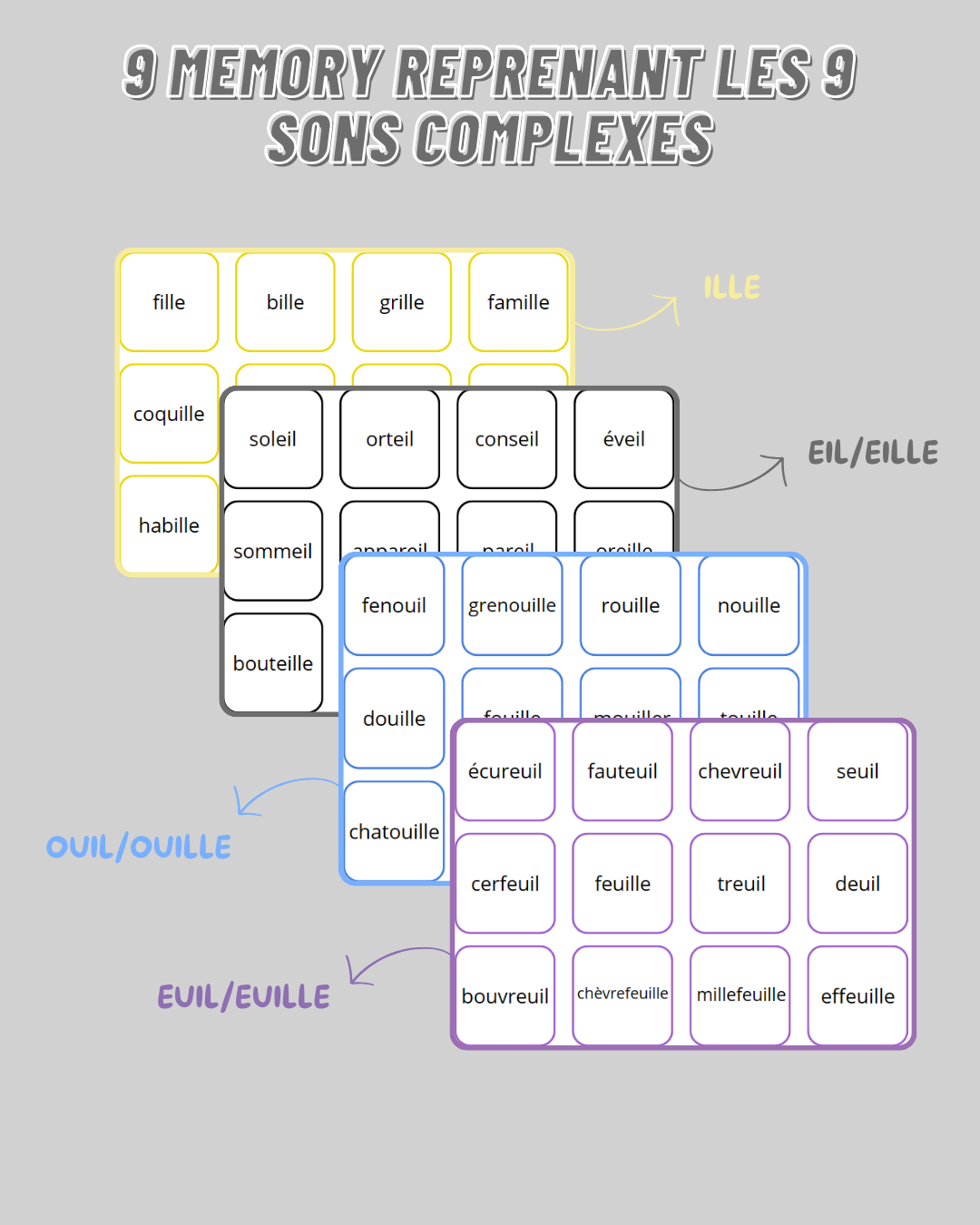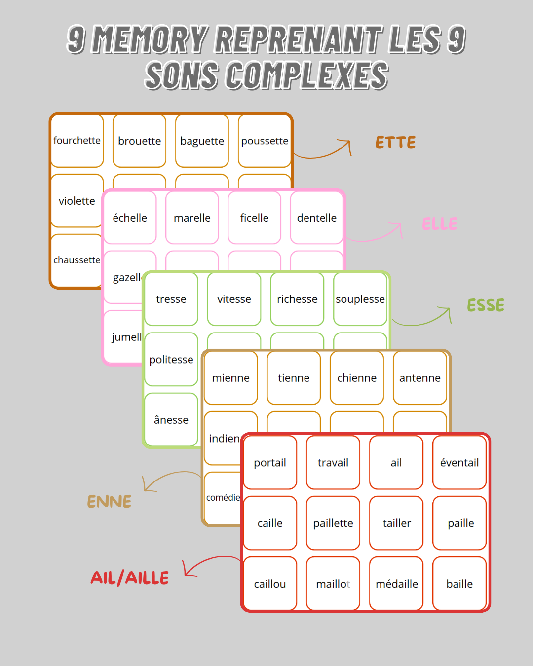 Sons complexes abordés : ail/aille, ille, eil/eille, ouil/ouille, euil/euille, ette, elle, essse, enne
