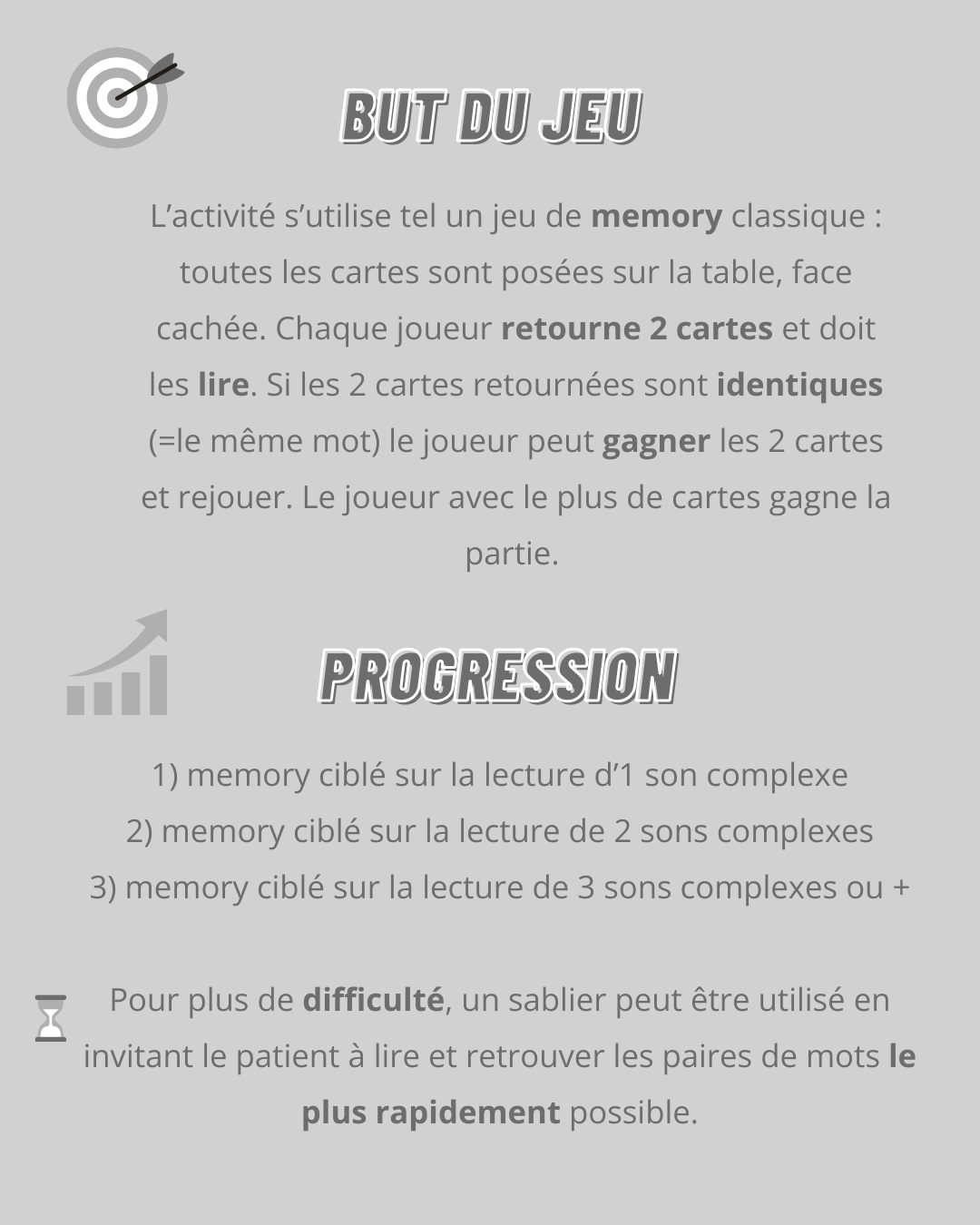 Chaque joueur retourne 2 cartes (posées face cachée) et doit les lire. Si les 2 cartes sont identiques, le joueur les emporte et rejoue. Le joueur avec le plus de carte remporte la partie !