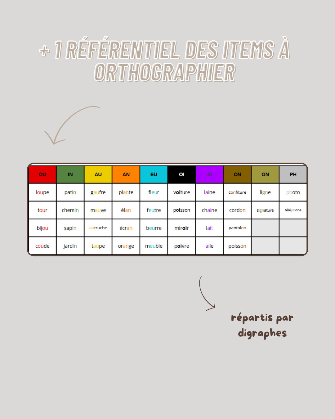- 1 référentiel des items à orthographier (classés par digraphes)