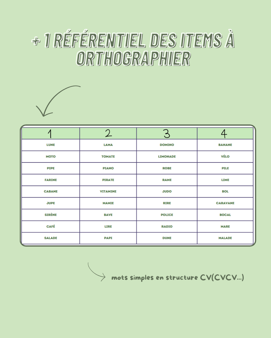 Il s’agit ici d’un PDF permettant de travailler plus précisément sur l’orthographe de mots SIMPLES en structure CV(CVCVCV)