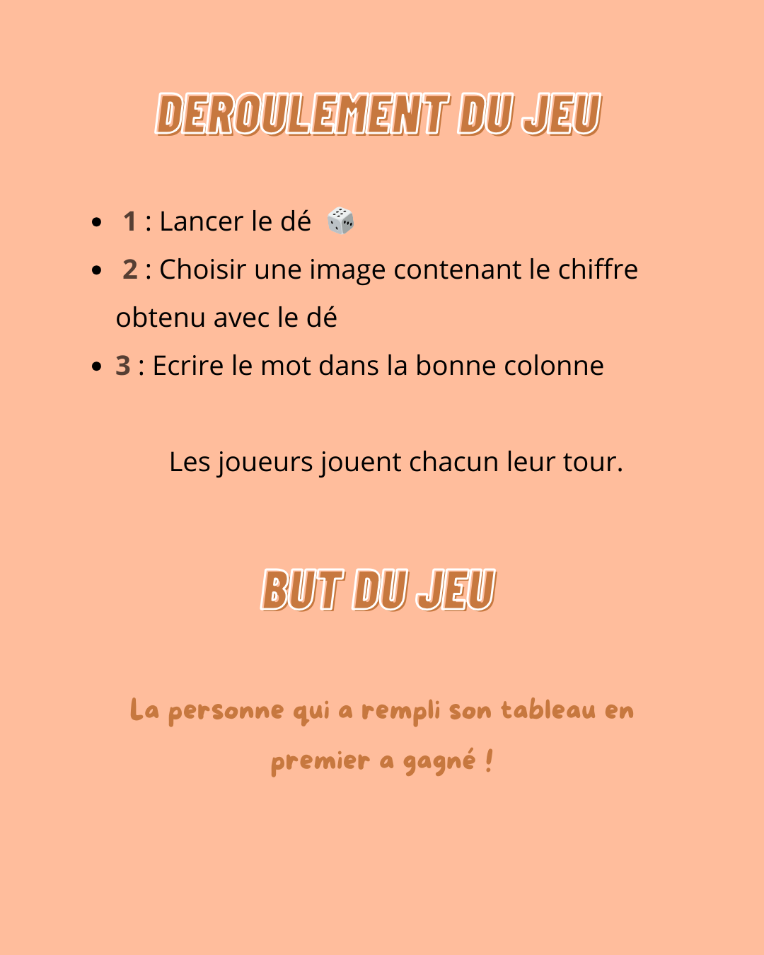 - Lancer le dé (personnalisez le avec les chiffres 1, 2, 3 et 4)