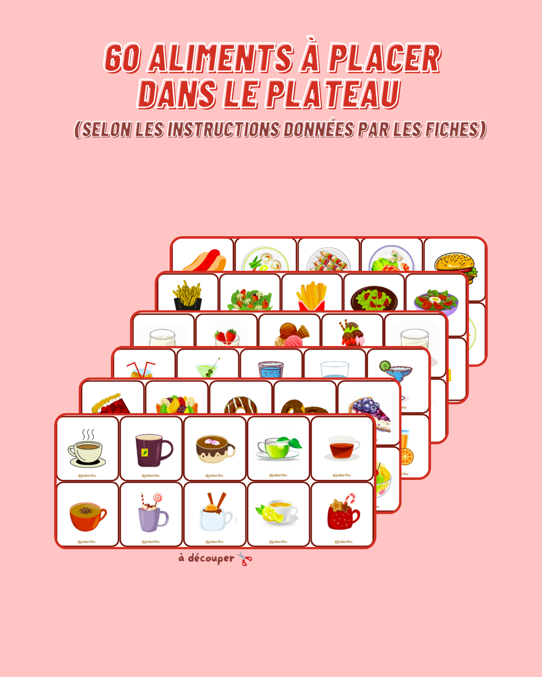 - 60 aliments à placer sur le plateau correspondant (= 10 pour chaque catégorie d’aliments cités ci-dessus) : à découper