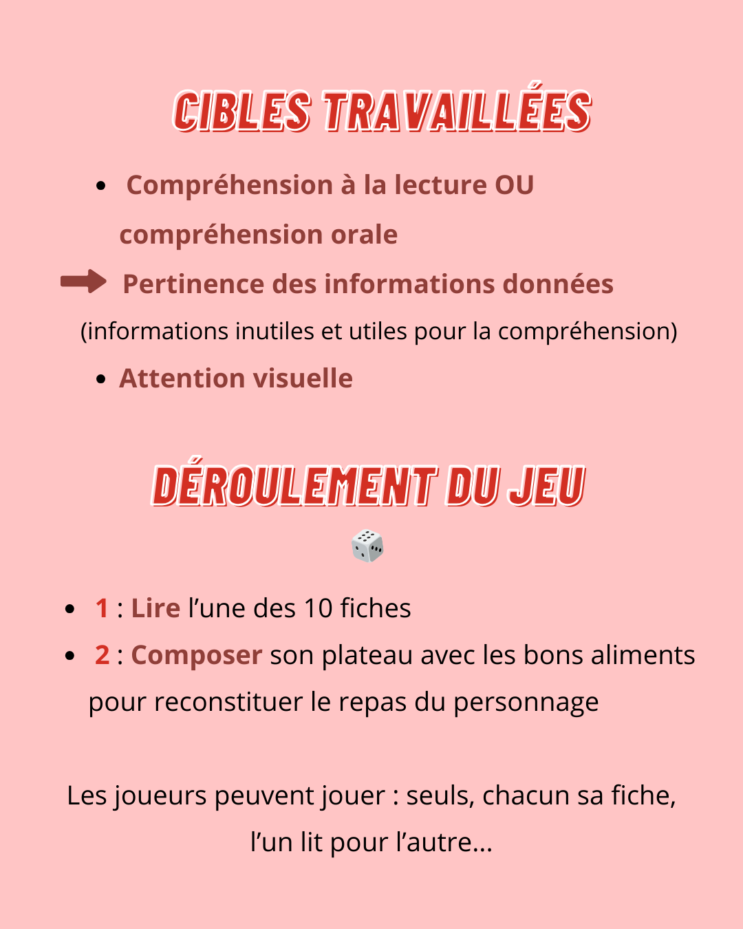 Sur certaines phrases, celui-ci permettra également de travailler le choix d’informations à garder (utiles) ou non (inutiles) pour le choix de l’aliment (pertinence) ainsi que l’attention visuelle (car présence de nombreux aliments) ; exemple : « Mon plat préféré est la pizza mais j’en mange trop donc j’ai opté pour… ».